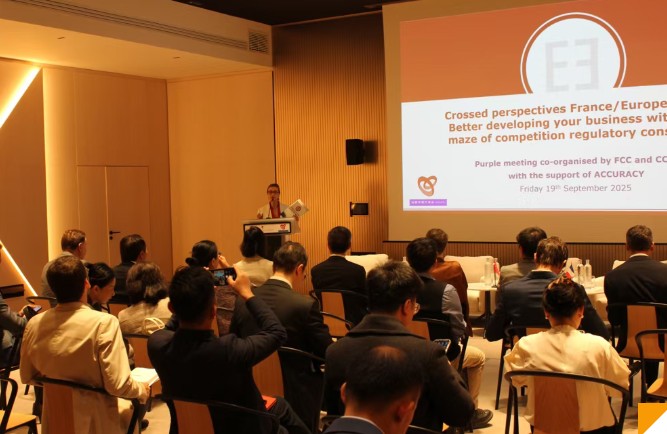 9月19日,法国中国工商会(CCICF)与法中委员会(CFC)在巴黎共同举办2025年第3次紫色会晤活动。本次活动主题为“中欧对话:在竞争监管新格局中探索投资发展之道”。活动由安可锐咨询公司(ACCURACY)协办,中法工商界代表和专家学者40余人参加。